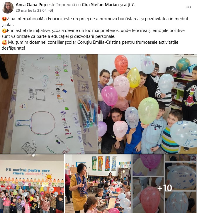 1. Activitate de incluziune ,,Ziua Internațională a Fericirii”, prof. Pop Anca, Cira Ștefan, Buga Nicoleta și consilier școlar Coruțiu Cristina
