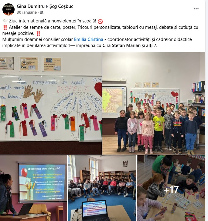 6. Activitate de incluziune: ”Ziua Internațională a Nonviolenței în Școală!” Prof. Dumitru Gina, Cira Ștefan, Coruțiu Cristina, Buga Nicoleta, Pop Anca, Târnoveanu Rodica, Pavelea Petruța.